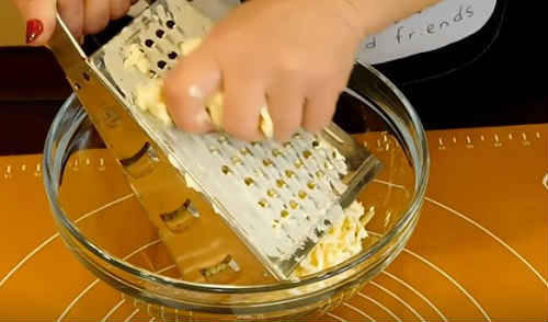 Натріть на крупній тертці вершкове масло. Не діставайте його заздалегідь з холодильника, щоб воно не підтануло, а ще краще закиньте в морозилку хвилин на 10. Ще одна порада: простежте, щоб масло було самої хорошої якості, не спред.