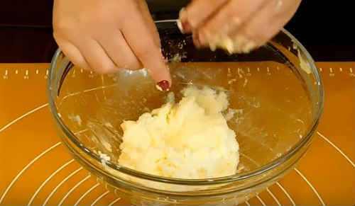 - Технологія приготування пісочного тіста не відрізняється від попередніх рецептів. Натріть масло, змішайте з половиною цукру.