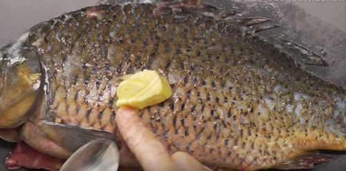 Обробіть тушку карпа. Випатрайте, зчистите луску, видаліть зябра. Плавці допустимо не зрізати. Натріть тушку сумішшю солі з перцем з обох сторін.