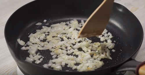 Покришіть цибулину дрібним кубиком, перекладіть на сковороду в розжарене масло. Обсмажуйте протягом 3 хвилин на помірному вогні, щоб цибуля стала прозорою.