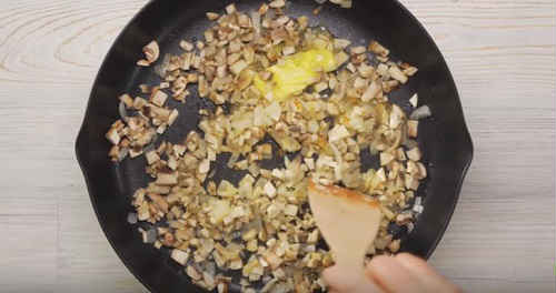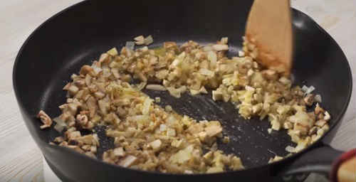Дуже дрібно поріжте гриби, покладіть до цибулі. Обсмажуйте разом, до красивого рум’яного кольору.
