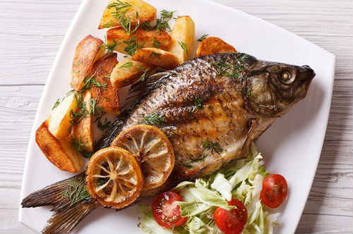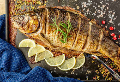 - Помийте карпа, обсушити, видаліть зябра, почистіть від луски. Натріть рибної приправою, сіллю. Замість зябер вкладіть по часточці лимона.