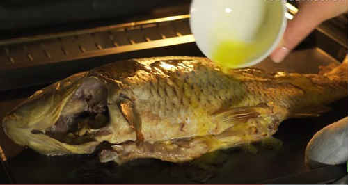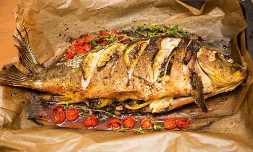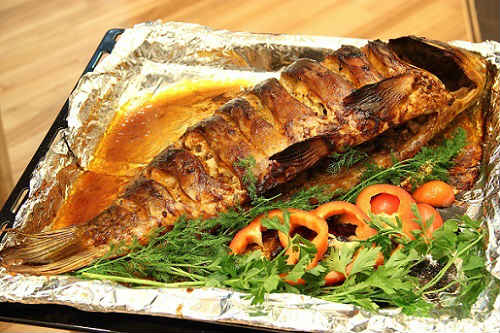 Ідеальний спосіб приготування коропа цілком. Всі інгредієнти відмінно поєднуються між собою, доповнюють і підкреслюють смак карпа.
