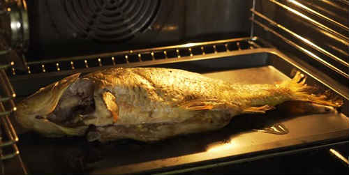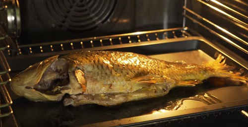 - Запікайте рибу протягом 30 хвилин при 190 про С. Після зніміть фольгу, продовжуйте готувати коропа ще чверть години, до рум’яної скоринки.