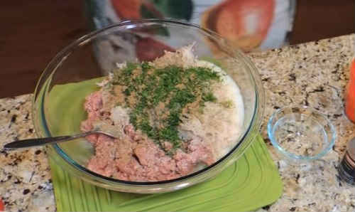 Засипте дрібно порубаний кріп, засипте манку. Манна крупа допомагає биточкам тримати форму, робить їх більш ніжними, пишними.