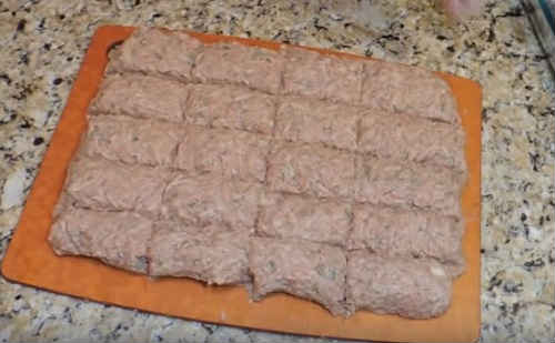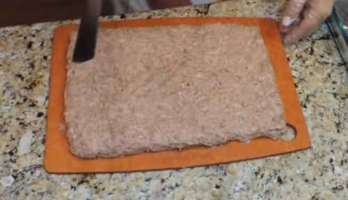 Можна зліпити котлетки, діючи традиційно, руками. Я пропоную сформувати страву по-іншому. Викладіть фаршевую масу на дошку, розрівняйте.
