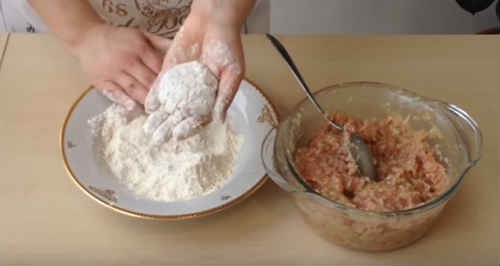 Візьміть в долоньки трохи фаршу, сформуйте овальну котлетку. Щоб биточки вийшли пишними, кілька разів перекиньте заготовку з руки в руку – це ще один секрет від професіоналів. Обваляйте заготовки в борошні.