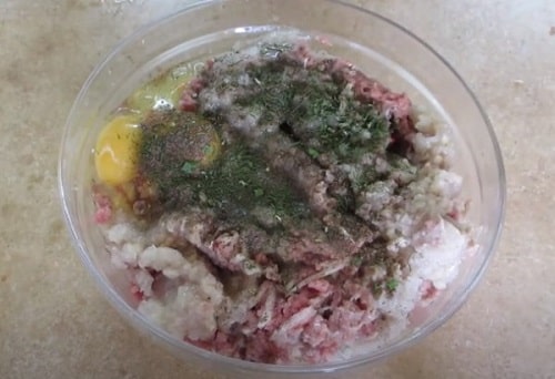 Вбийте яйця. Заправте фарш перцем, сіллю, сушеним кропом і петрушкою (або свіжою зеленню). Вимісити фарш, щоб інгредієнти рівномірно розподілилися.
