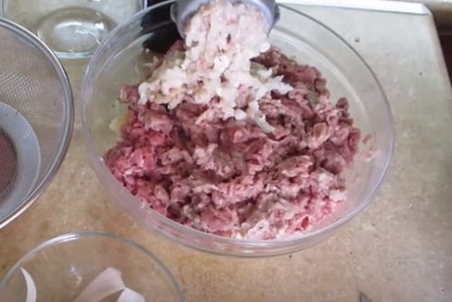 - Дрібно покришите цибулину, відправте слідом. Якщо робите фарш самостійно, поверніть цибулину через м'ясорубку разом з м'ясом.