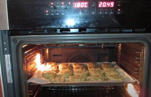 - Запікайте котлети приблизно 25 хвилин, прогрів духовку до 180 о С. Потім переверніть, поверніть в піч. Продовжуйте готувати ще стільки ж, якщо заготовки великі. По ходу перевіряйте готовність страви. Котлети вийдуть добре пропечений і підсмажений з обох сторін.