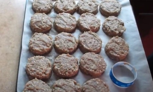 Постеліть на деко пергамент. Викладіть заготовки котлет. Ліпіть їх по-старому, руками. Або ж за допомогою, як на фото, саморобну заготовку – гурток, вирізаний з баночки з-під сметани. Тоді котлети вийдуть однакового розміру.