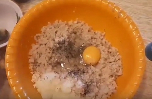 - Перекладіть в прокручений фарш. Посоліть масу, додайте яйця, здобріть перцем. Добре розмішайте фарш, трохи відбийте.