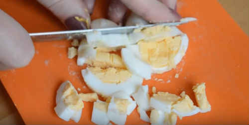 Завчасно відваріть яйця, охолодіть. Покришіть кубиками, покладіть в салатник.