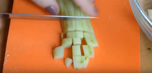 Зчистите з огірків шкірку, щоб у страві вони стали ніжніше. Поділіть аналогічно яйцям.