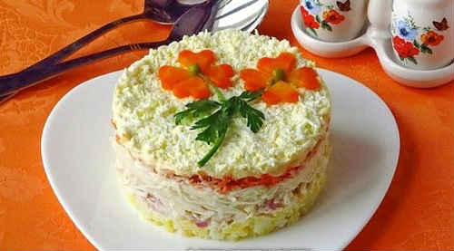 Дуже ніжний, соковитий салат, який робиться шарами. Його можна викласти на великому блюді або зробити порційно, у високих келихах.