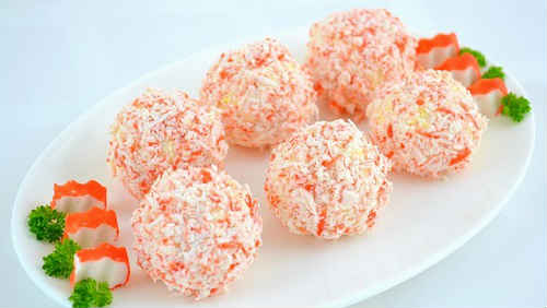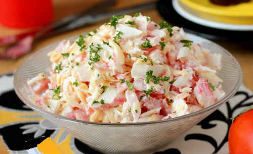 Перелічити всі продукти, дружньо налаштовані до ніжному смаку крабового продукту неможливо. Тут рідні, звичні, а також заморські дивини, начебто авокадо. Якщо детальніше, то у складі рецептів ви зустрінете гриби, кукурудзу, моркву, яйця, часник, помідори, болгарський перець, рис, шинку. Нерідкі фрукти – ананаси, яблука. З сиром ціле роздолля! Крім твердих сортів, кладіть у закуску ковбасний копчений сир адигейський, сулугуні, плавлений сирок. Страви набувають дуже цікавий смак, якщо додати інші дари моря – червону рибу, ікру, кальмари, креветки. Я підібрала найкращі, на мій погляд, рецепти крабових закусок.