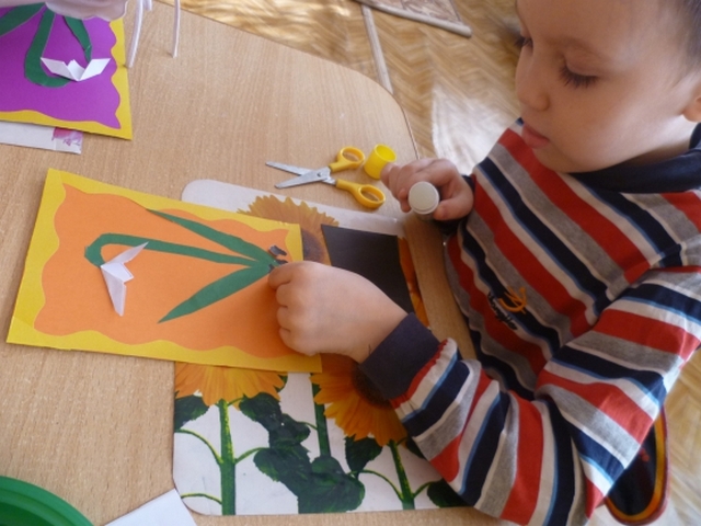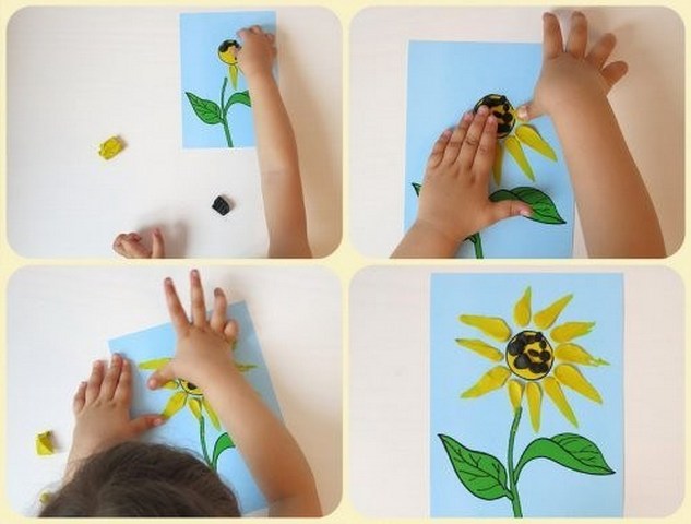 Ще одна чудова аплікація, але робиться вона не з паперу, а з пластиліну. Якщо діти зовсім маленькі, то для них треба намалювати шаблон соняшника. Якщо ж вони вже передшкілької віку, то повинні скласти малюнок з пластиліну самостійно.