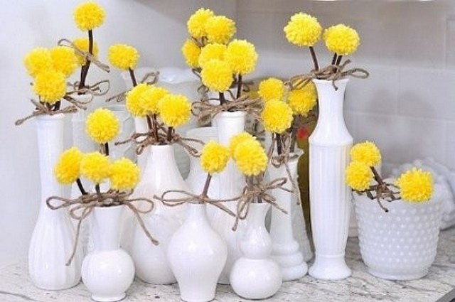 З нитки робимо помпончики, які кріпимо до гілочці дерева. Збираємо ось такий букетик, який можна поставити у вазу.