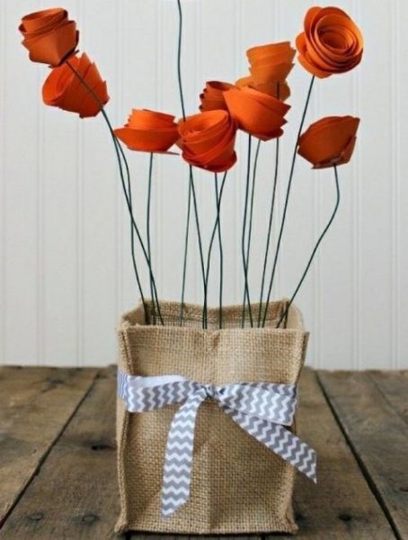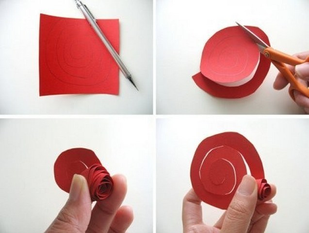 Зробити таку саморобку нескладно. На червоному папері малюємо спіральну смужку, яку вирізаємо. Потім методом квілінгу скручуємо її. В результаті отримуємо квітка.