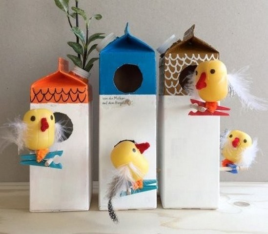 Якщо у вас залишилися молочні пакети і яйця від кіндер-сюрпризів, то можна зробити таку цікаву саморобку з будиночками і пташками.