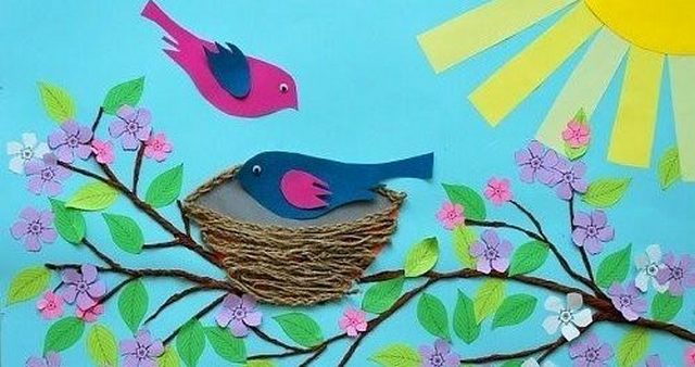 Тому ця ідея весняної аплікації з пташками і квітучим деревом підійде для ваших занять.