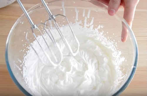 Окремо збийте вершки. Перед цим, обов’язково охолодіть їх, тоді крем вийде щільним, густим. Працювати міксером доведеться досить довго, поки маса не зіб’ється до стійких піків, як на фото.