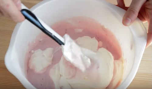 Тонким струменем залийте розбещений і остиглий желатин. Якщо рідкий йогурт, слід взяти більше желатину, крем повинен бути густим.