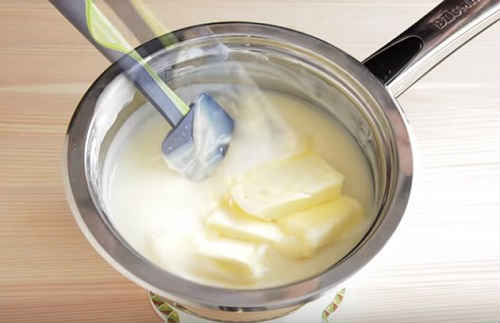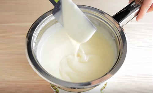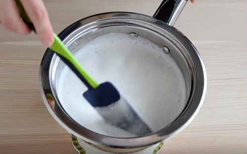 - Дану суміш необхідно прогріти на водяній бані. Після закипання води в нижній каструлі, проваріть її 6-8 хвилин, не забуваючи помішувати. Маса повинна загуснути. Потім охолодіть вміст.