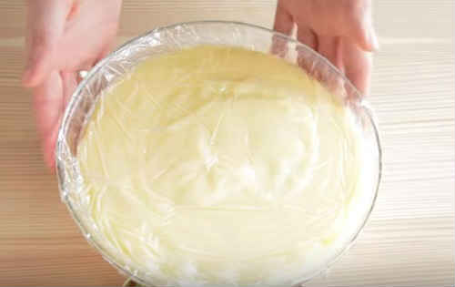 Накрийте миску з кремом харчовою плівкою. При цьому враховуйте, що поверхня маси швидко схоплюється плівкою. Тому накривайте щільно, в контакт. Надішліть крем на полицю холодильника для охолодження.