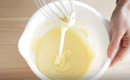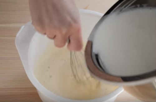 - Закип’ятіть молоко, трохи остудіть його. Влийте тонкою цівкою в жовткову суміш. Не припиняйте працювати віночком ні на секунду, інакше жовтки згорнуться.