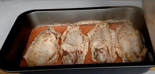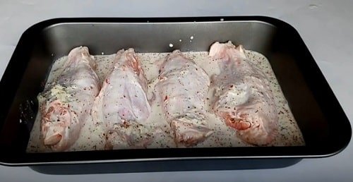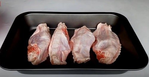 - Плечову частину птиці натріть сумішшю перцю з сіллю, і розчавленим пресом часником. Потримайте півгодини, щоб м'ясо просочилося часниковим ароматом.