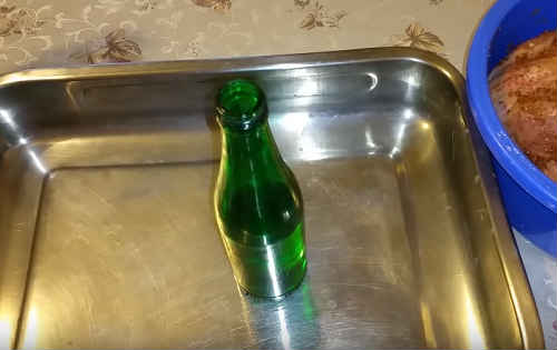 Уважно прочитайте вимоги до пляшках. Беріть скляні ємності стандартної форми з об’ємом 0,5 літра. Як правило, вони легко поміщаються всередині тушок. Якщо знайдете пляшку з більш широким горлом, вважайте, вам пощастило. Зверніть увагу на висоту посуду, ніжки птиці повинна звисати, не торкаючись дна форми.