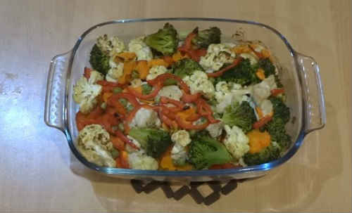 Розберіть на суцвіття брокколі і цвітну капусту, викладіть рівномірним шаром по всій поверхні.