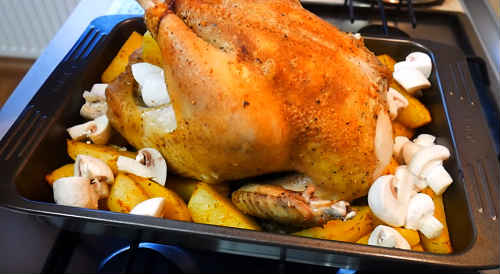 Дуже смачна, соковита, з чудовою скоринкою, курка безсумнівно викличе захоплення всім, кому дістанеться хоч шматочок. Крім картоплі, додамо гриби, ці два продукти завжди відмінно поєднуються. Блюдо гідно святкового столу, стане його окрасою.