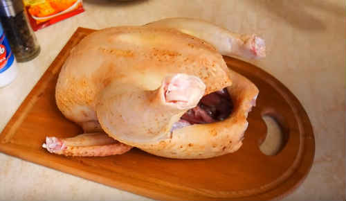 Помийте курячу тушку, зріжте кінчики крил, інакше вони згорять (або оберніть їх фольгою).