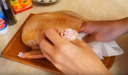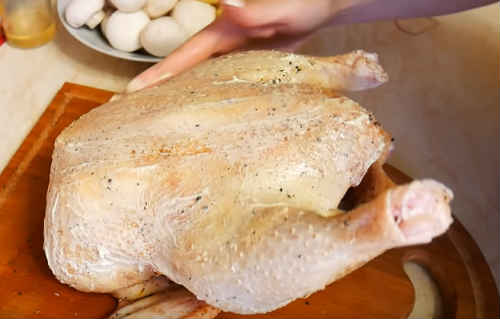 Натріть тушку сіллю з перцем. Можна взяти інші приправи, але не раджу, буде перебір, курка отже буде дуже смачною. Хоча, якщо дуже захочеться, не стримуйте себе. Не забудьте полити тушку спеціями всередині.
