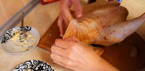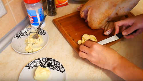 Тепер важливий момент. Відсуньте шкірку, візьміть пальчиками частина масляної суміші і засуньте подалі під шкіру. Заповніть всі місця, що зможете вгорі і внизу, в районі ніжок, поки часникове масло не закінчиться. Це тільки на перший погляд складно, насправді все напрочуд легко.