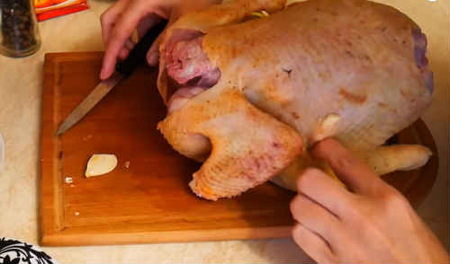 Часник, як правило, горить, тому ми сховаємо. Кілька пластин часнику вкладіть всередину кури. Іншими нашпигуйте тушку з задньої сторони, зробивши кілька розрізів ножем. Якщо будуть стирчати, нічого страшного. Не бійтеся робити багато надрізів, шпигуйте з усіх боків.