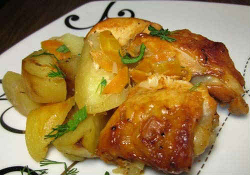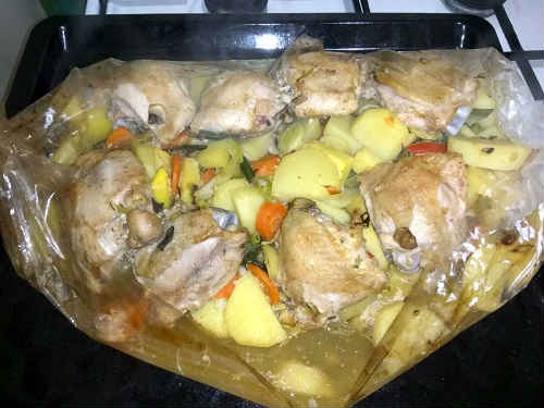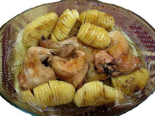 Відмінний приклад запікання в рукаві шматочками без майонезу, що знизить жирність і калорійність страви. Можна використовувати чисте філе курки, готувати окремо ніжки, стегна.