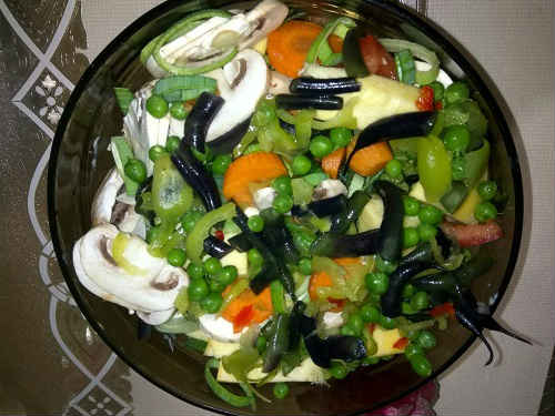 Рецепт приготування до непристойності простий, я навіть кількість інгредієнтів не вираховується, беру на око. І овочі беру будь-які. В цей раз дістала готову магазинну заморожену суміш.