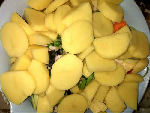 Почистіть клубки картоплі, наріжте великими кругляшками.