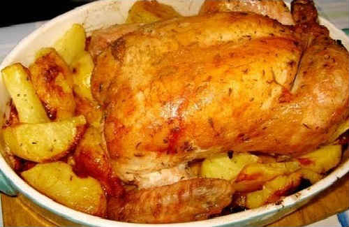 Класичний рецепт приготування м’яса, запеченого з картоплею. В оригіналі вказана курка цілком, але якщо поділіть тушку на шматочки, на смак страви це не позначиться.