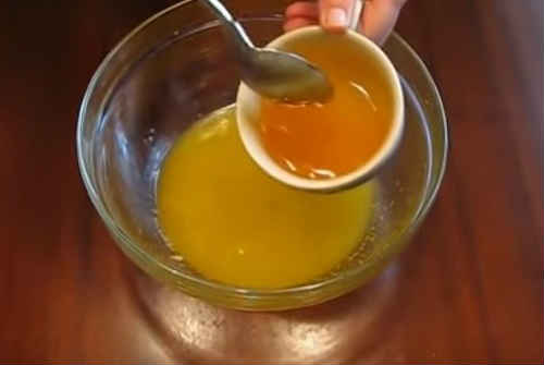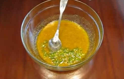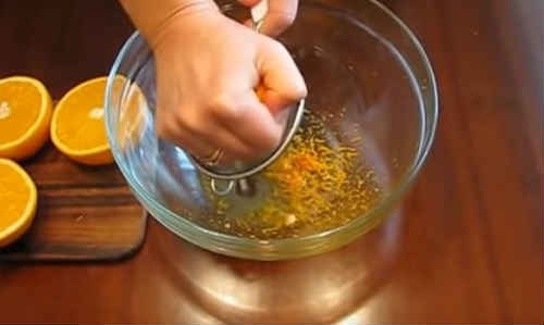 - Вичавіть сік з одного цитрусового фрукта. Додайте до нього мед, гірчицю зернами, перець, підсолити. Сумлінно перемішайте.