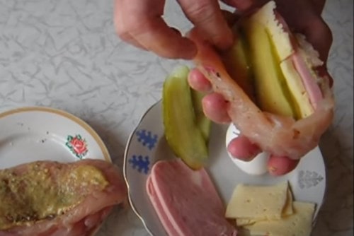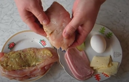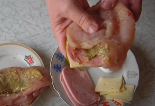 Дивіться на фото, як виглядає напівфабрикат фаршированої курячої грудки.