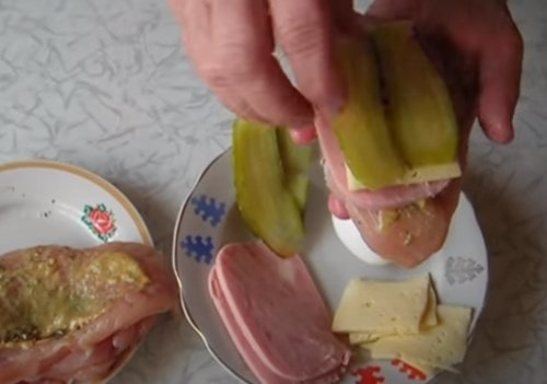 Покладіть заготовку фаршированої курки на долоню гірчичною стороною вгору. Покладіть зверху пластину шинки, сиру, 2 слайсу огірка.