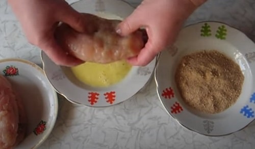 В одній тарілці розколотіть виделкою яйце, на іншу насипте сухарі. Зробіть подвійне панірування заготівлі.