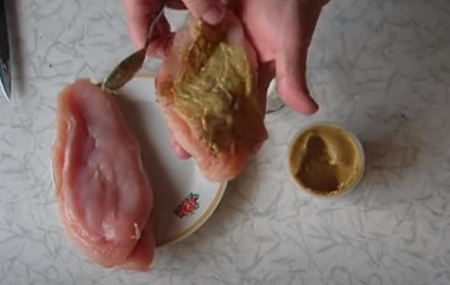 - Підготуйте на курячому м’ясі невеликі кишеньки. Саме філе натріть сумішшю сіль з перцем.