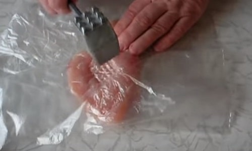 Прикрийте заготівлю харчовою плівкою, трохи відбийте м’ясо кухонним молоточком.