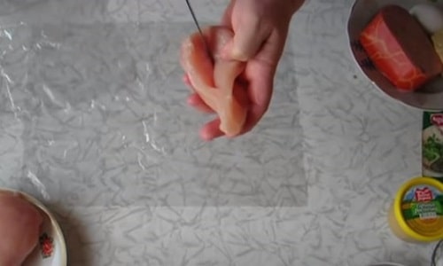 - Підготуйте курку, зробивши кишені на філе грудок.