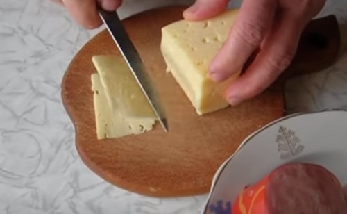 Підготуйте шинку, також відрізавши 3 шматочка. Постарайтеся, щоб величина сиру і шинки збігалися з розміром кишеньки на грудці.